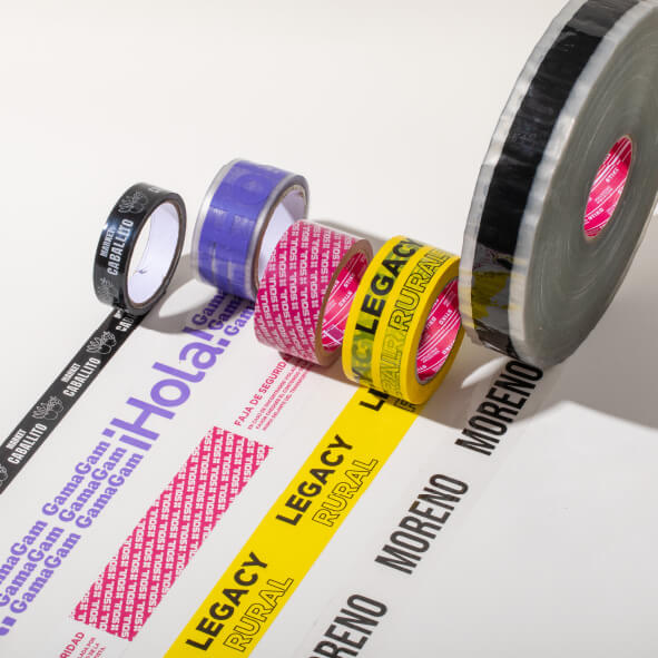 Cintas para embalaje fabricadas en BOPP (polipropileno Bi-orientado) y adhesivo acrílico base acuosa, preso-sensible (sensible a la presión), resistente a la luz solar, impresas con logos personalizados.